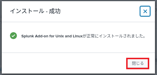 (10) Splunk Add-on for Unix and Linuxの設定をするかどうかメッセージが表示されるため、「閉じる」をクリックする。