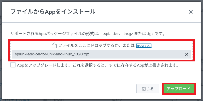 (9) ダウンロードしたファイル(例:splunk-add-on-for-unix-and-linux_1020.tgz)をインストールするサーバ上に格納する。