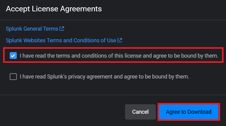 (3) ライセンスの条件に同意するにチェックを付けて、「Agree to Download」をクリックする。ファイル(splunk-add-on-for-unix-and-linux_1020.tgz)をダウンロードされる。