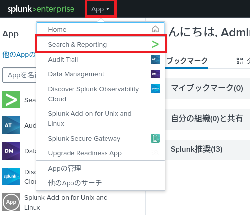 (1) Splunk Enterpriseの[App] > [Search & Reporting]をクリックする。