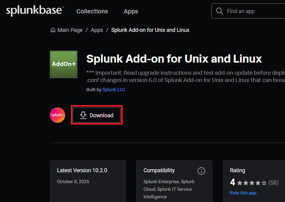 (6) ブラウザを用いて「https://splunkbase.splunk.com/app/833」にアクセスして、「Download」をクリックする。