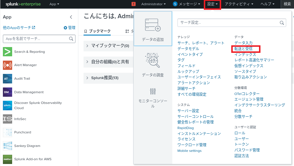 (1) Splunk Enterpriseの[設定] > [転送と受信]をクリックする。