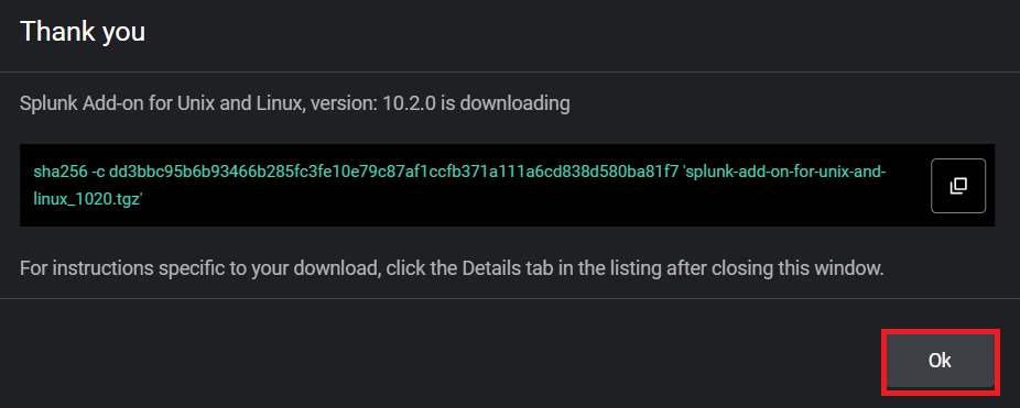 (8) 「splunk-add-on-for-unix-and-linux_1020.tgz」ファイルがダウンロードされる。その後、「OK」をクリックする。