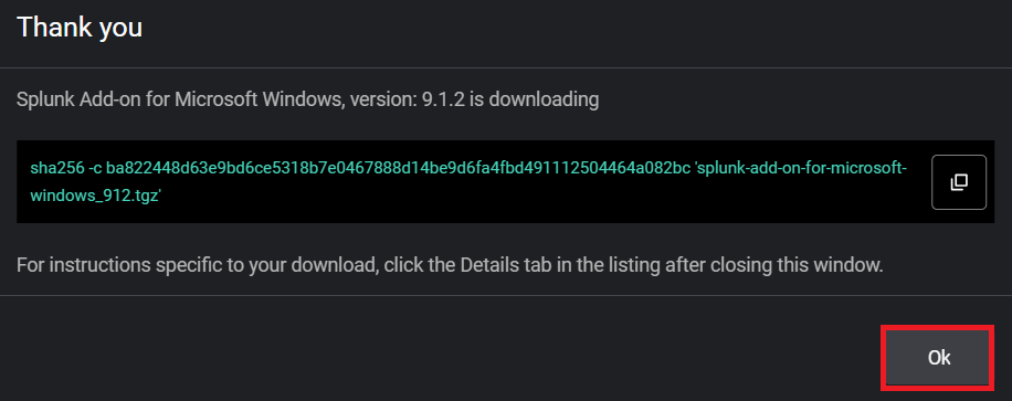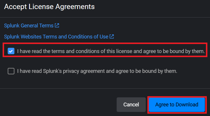 (3) ライセンスの条件に同意するにチェックを付けて、「Agree to Download」をクリックする。ファイル(splunk-add-on-for-microsoft-windows_912.tgz)をダウンロードされる。