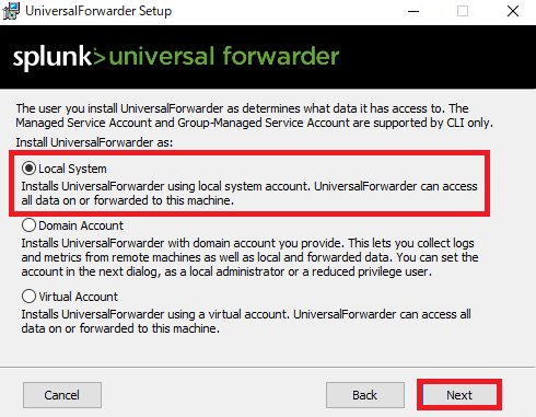 (5) 「Local System」にチェックを付けて、「Next」をクリックする。