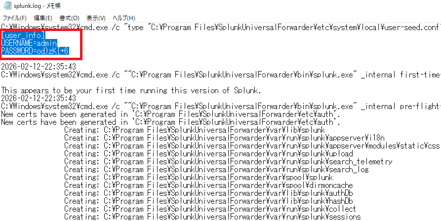 (12) 「C:\Users\<UserName>\AppData\Local\Temp\splunk.log」の内容を確認し、Universal Forwarder用のユーザー名とパスワードを確認する。