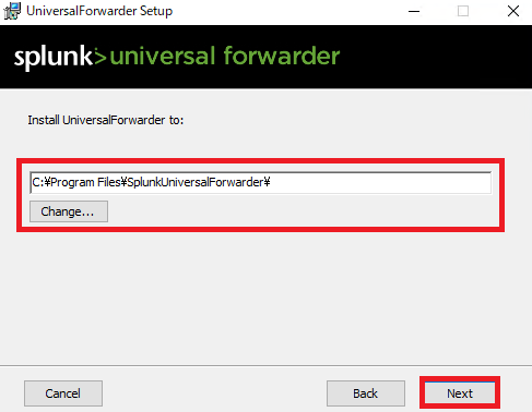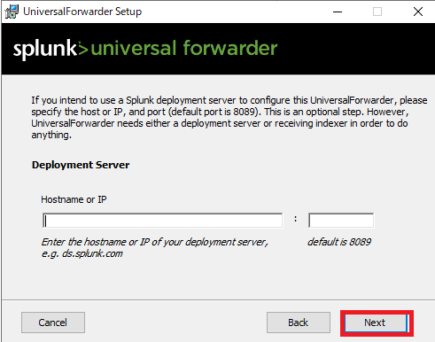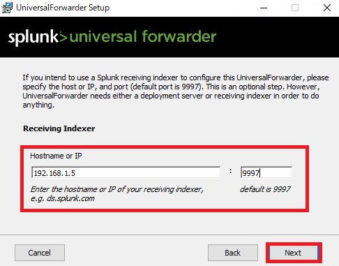 (9) データの送信先のSplunk Enterpriseのホスト名またはIPアドレスと受信ポートを設定して「Next」をクリックする。