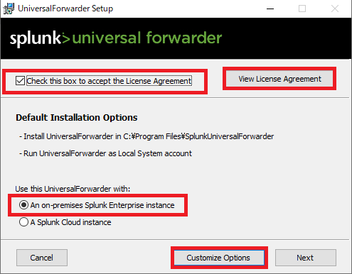 (2) ライセンス条項を確認して、「Check this box to accept the License Agreement」にチェックを付ける。その後、「An on-premises Splunk Enterprise instance」にチェックを付けて、「Customize Options」をクリックする。