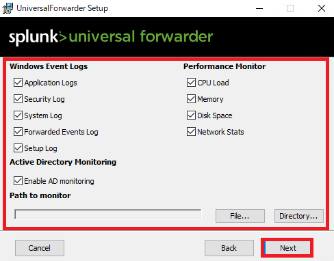 (6) Splunkに送信するログの種類を選択し、「Next」をクリックする。