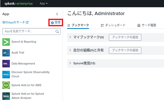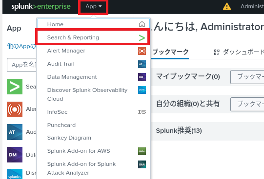 (1) Splunk Enterpriseの[App] > [Search & Reporting]をクリックする。