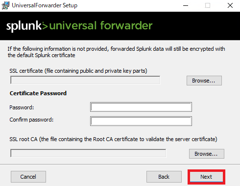 (4) 必要に応じてSSLの証明書を設定する。今回は何も設定せずに「Next」をクリックする。