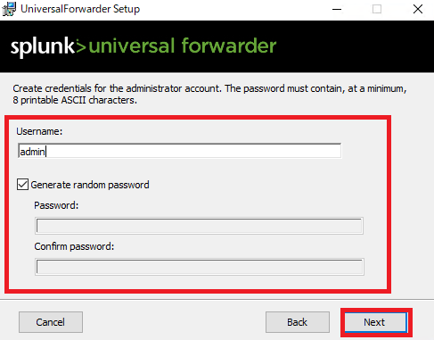 (7) Universal Forwarder用のユーザー名とパスワードを設定して、「Next」をクリックする。「Generate random password」にチェックを付けた場合は、「C:\Users\<UserName>\AppData\Local\Temp\splunk.log」にパスワードが記載される。