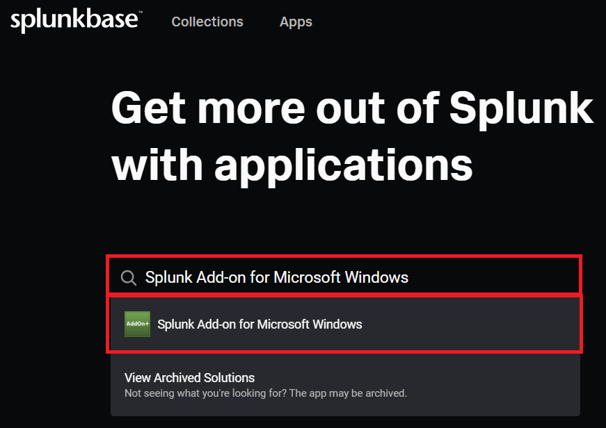 (1) ブラウザを用いて「https://splunkbase.splunk.com/」にアクセスする。その後、「Splunk Add-on for Microsoft Windows」を検索し、「Splunk Add-on for Microsoft Windows」をクリックする。