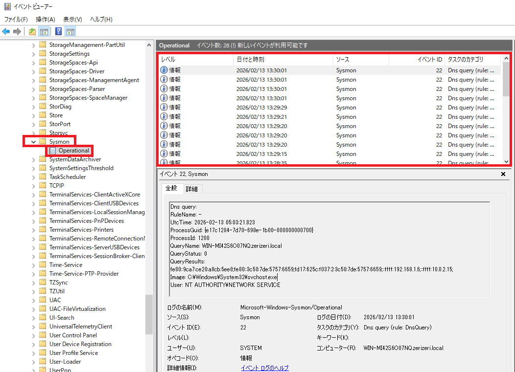 (2) Sysmonのログをフィルタして検索すると、ログの一覧が表示されることを確認する。