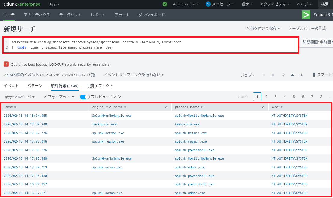 (3) 例えば作成されたプロセス(イベントコード:1)の日時、親プロセス、プロセス名、実行ユーザー、ファイルを作成した会社の一覧を表示する際は、以下の検索文字列(SPL文)でフィルタする。