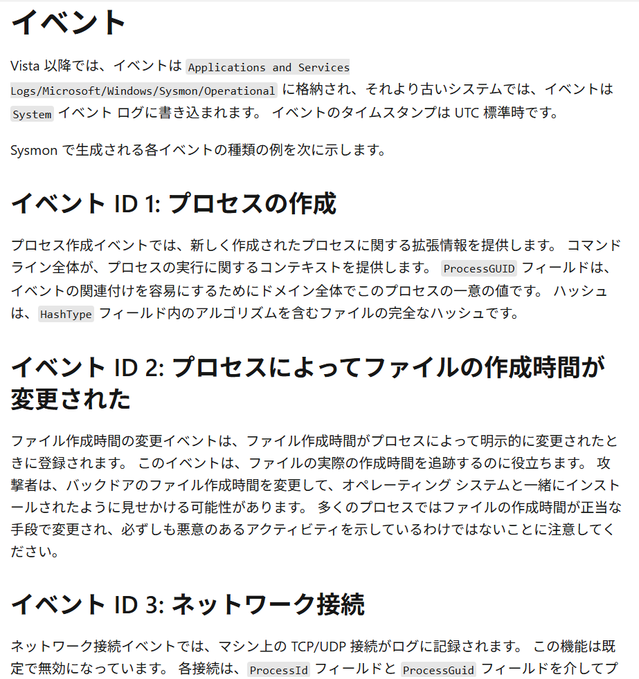 (3) Sysmonのログの詳細を調べる際は「https://learn.microsoft.com/ja-jp/sysinternals/downloads/sysmon」の下部に記載されている説明を確認する。