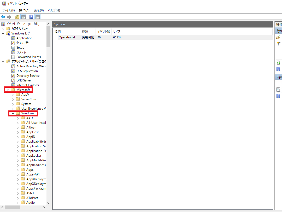 (2) [アプリケーションとサービス ログ] > [Microsoft] > [Windows] > [Sysmon] > [Operational]を開いて、Sysmonにて出力されたログがあることを確認する。