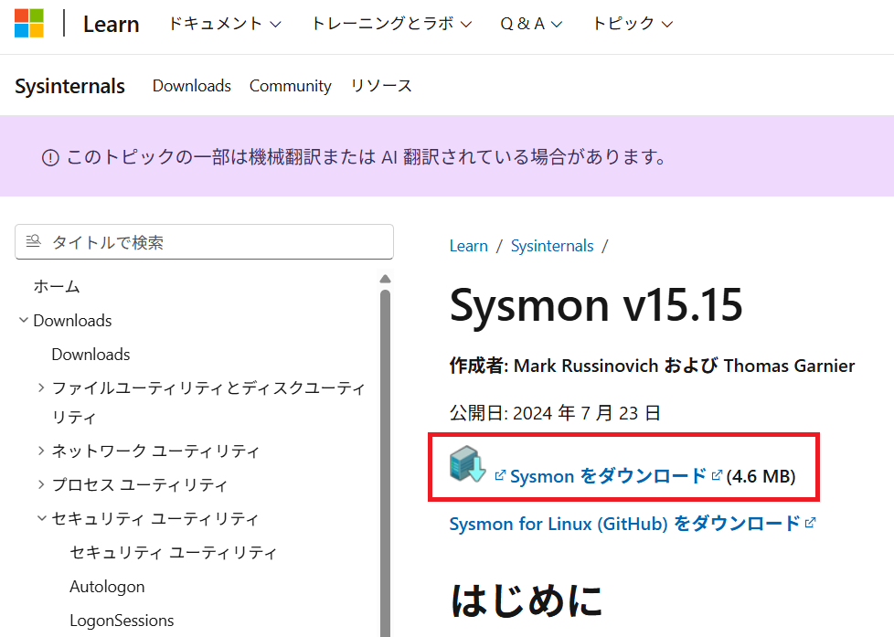(1) ブラウザを用いて「https://learn.microsoft.com/ja-jp/sysinternals/downloads/sysmon」にアクセスし、Windows版のSysmonのインストーラーの圧縮ファイル(Sysmon.zip)をダウンロードする。