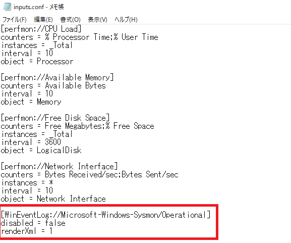inputs.conf」の末尾にSysmonのログを送信する設定を入れる。